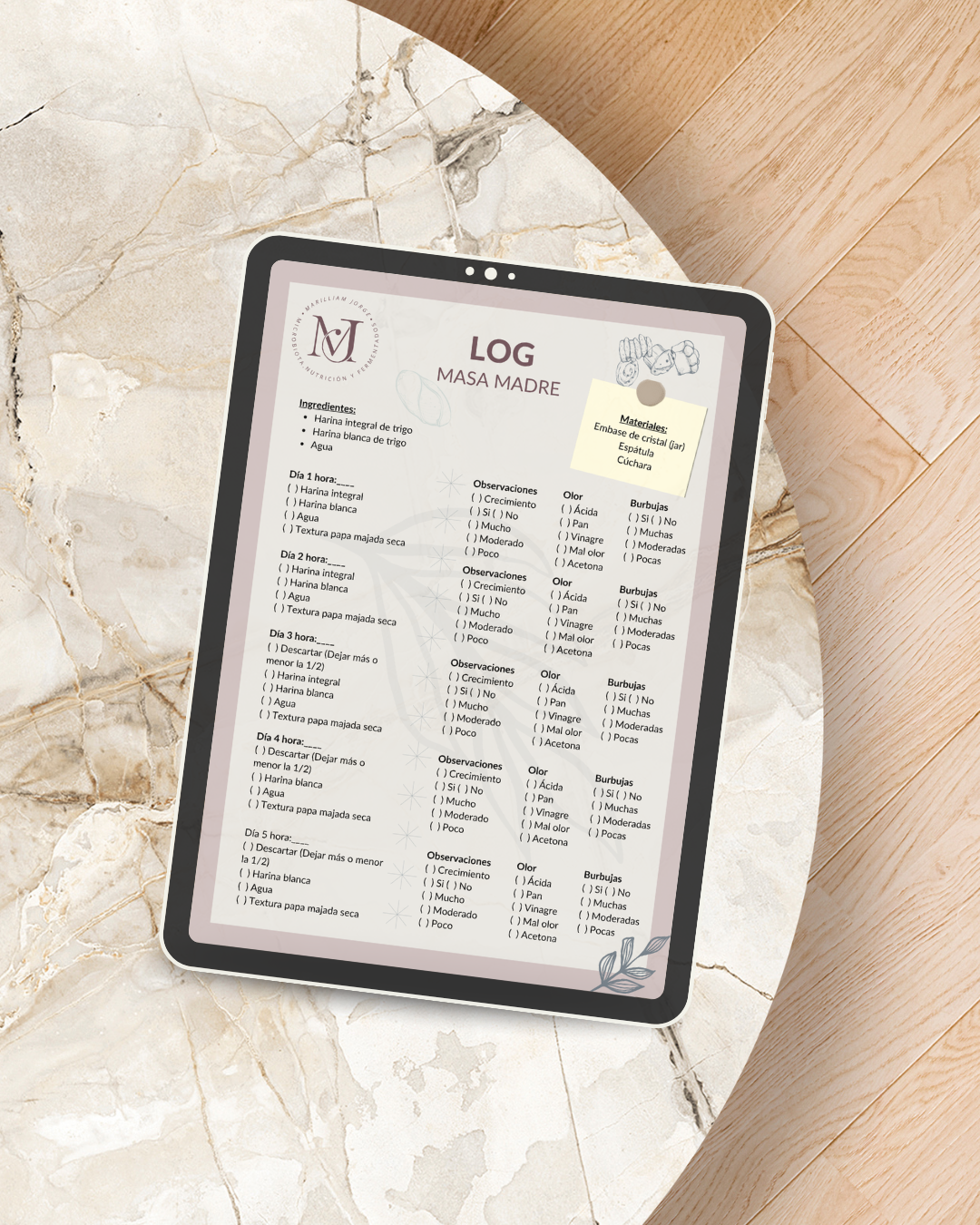 ✓ Log de seguimiento diario, para que sepas exactamente qué hacer y cómo avanza tu masa madre día a día.